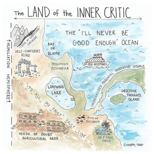 Yup, that’s your inner critic right there, the voice in your head that just won’t quit. Call it your inner critic, judge, saboteur, or superego. This roommate of yours is always ready with a snarky comment, a harsh judgement, and a never-ending stream of negativity. It’s like having a personal heckler, 24/7! We know it can be pretty annoying but don’t worry, it’s not just you – we all have an Inner Critic living rent-free in our brains! And here’s the thing – this inner critic isn’t just a nuisance, it can actually have a serious impact on your self-esteem.  And while it may not be the most pleasant housemate, with a little humour and self-awareness, we can learn to coexist and even become friends.