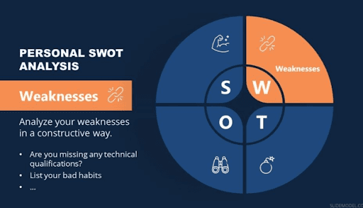 No one expects you to be perfect so your career SWOT analysis can include weaknesses in great detail. Your weaknesses are things you need to work on or aren’t very good at. We know how you want to present yourself as an excellent human and this self-esteem crushing exercise won’t help. However, it can be the most beneficial component of the investigation and when all is said and done, it might be the bit that inspires you the most.