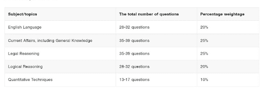 150 comprehension-based multiple-choice questions (MCQs) from five subjects—English Language, General Awareness, Current Legal Reasoning, Quantitative Techniques, and Logical Reasoning—make up the CLAT exam paper for UG courses.